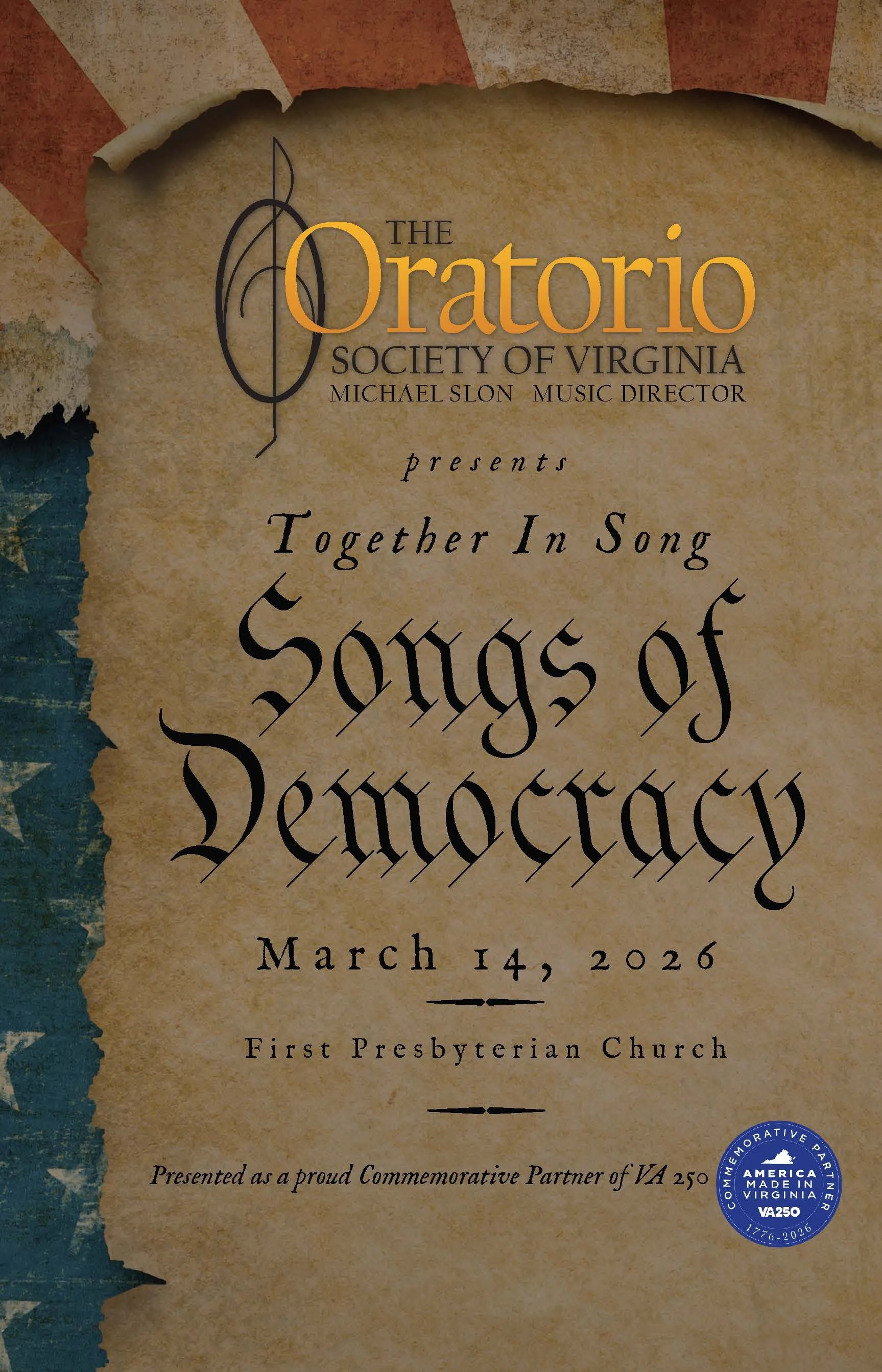 The Oratorio Society’s 100-voice chorus, along with community singers from the morning workshop, and guest youth choir, Voces Laetae, will present a special program honoring our nation’s 250-year history in collaboration with Virginia 250 — the state commission of America250, a nationwide bipartisan initiative to celebrate the values of our democracy.
